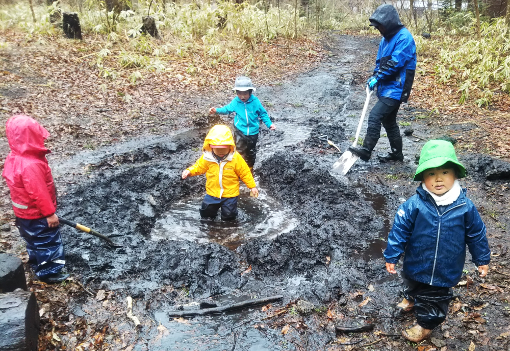 木々が芽吹き小鳥さえずるなか シャベルを手に泥んこ遊び