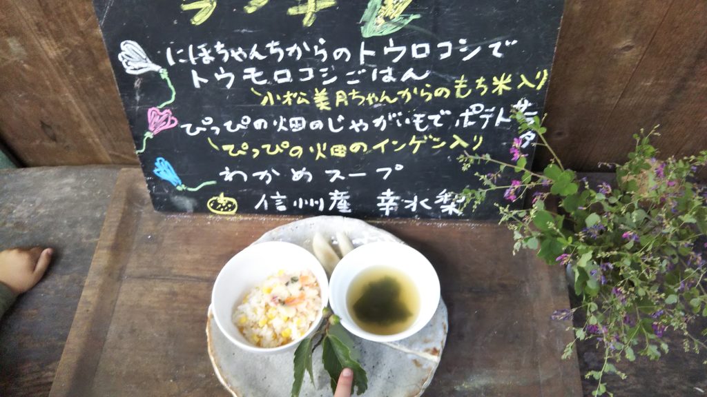 ぴっぴの食で大切にしていることは「おいしく食べること」です。お料理自体がおいしいことはもちろんですが、それ以上にランチの時間が「おいしい時間」「幸せな時間」と感じられる場であること。森の中でたっぷり遊んで、お腹がペコペコになると、みんなで食べるランチが更においしくなるのです。お腹が空くことは最高の調味料になるのでしょうね。ぴっぴで食べるお米はぴっぴの田んぼでつくっています。みんなで代掻き、田植えや稲刈り、かかし作りなど子どもたちと行い、大切なお米を作っていきます。お米以外の食材は遺伝子組み換え、化学調味料ではないものを選んでいます。なるべく地元で採れた野菜や果物を選んでいます。子どもだからこそ、丁寧に作られた食材、安心で安全な料理を食べて欲しいと願っています。