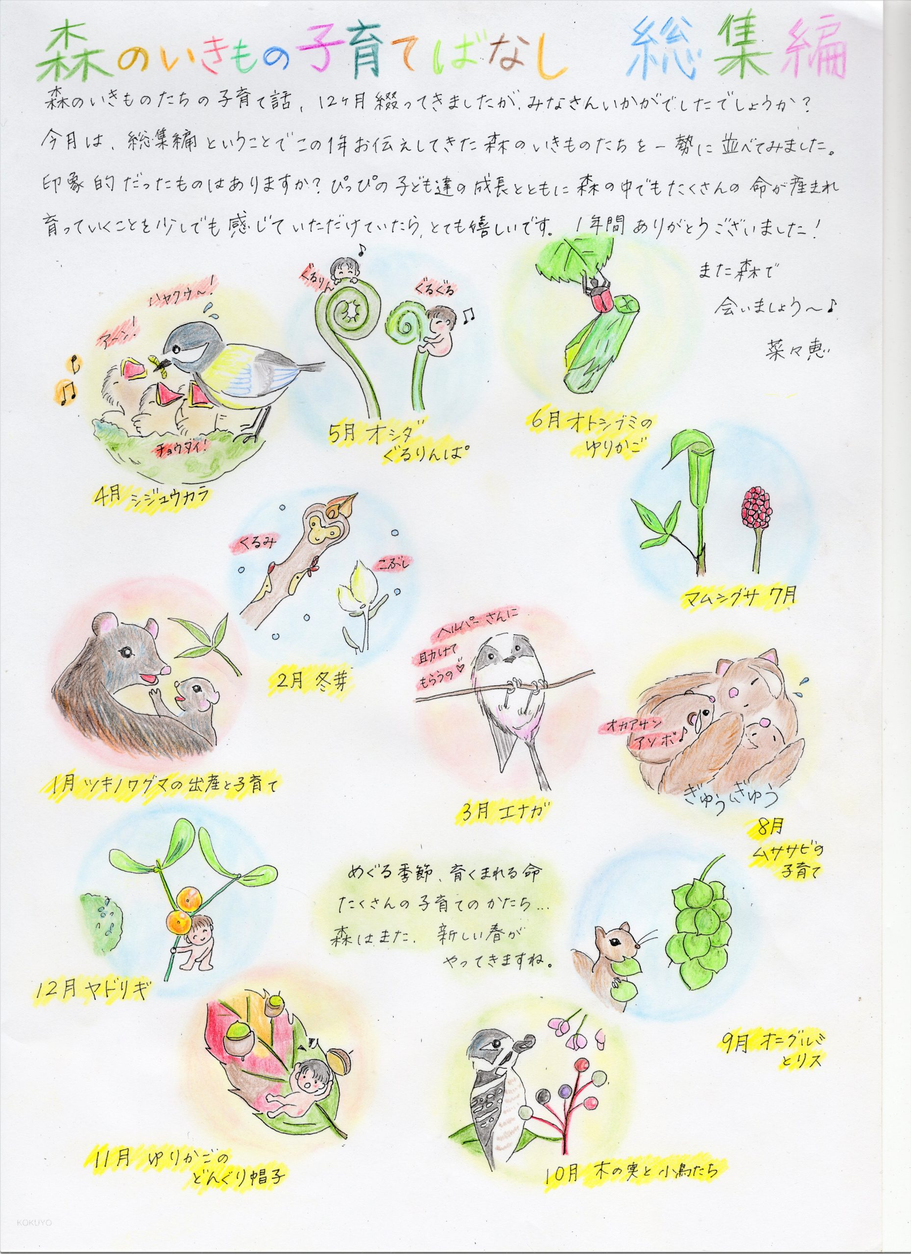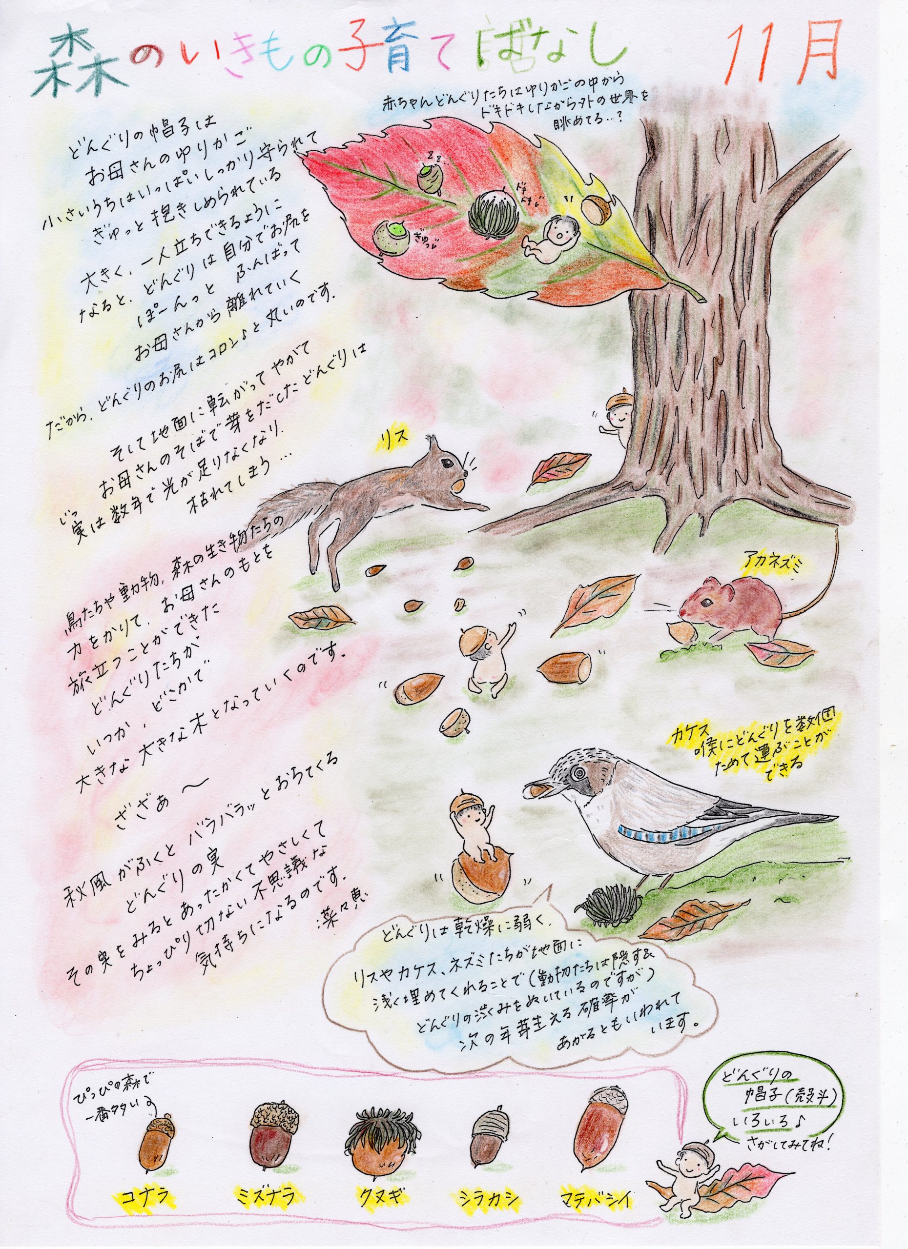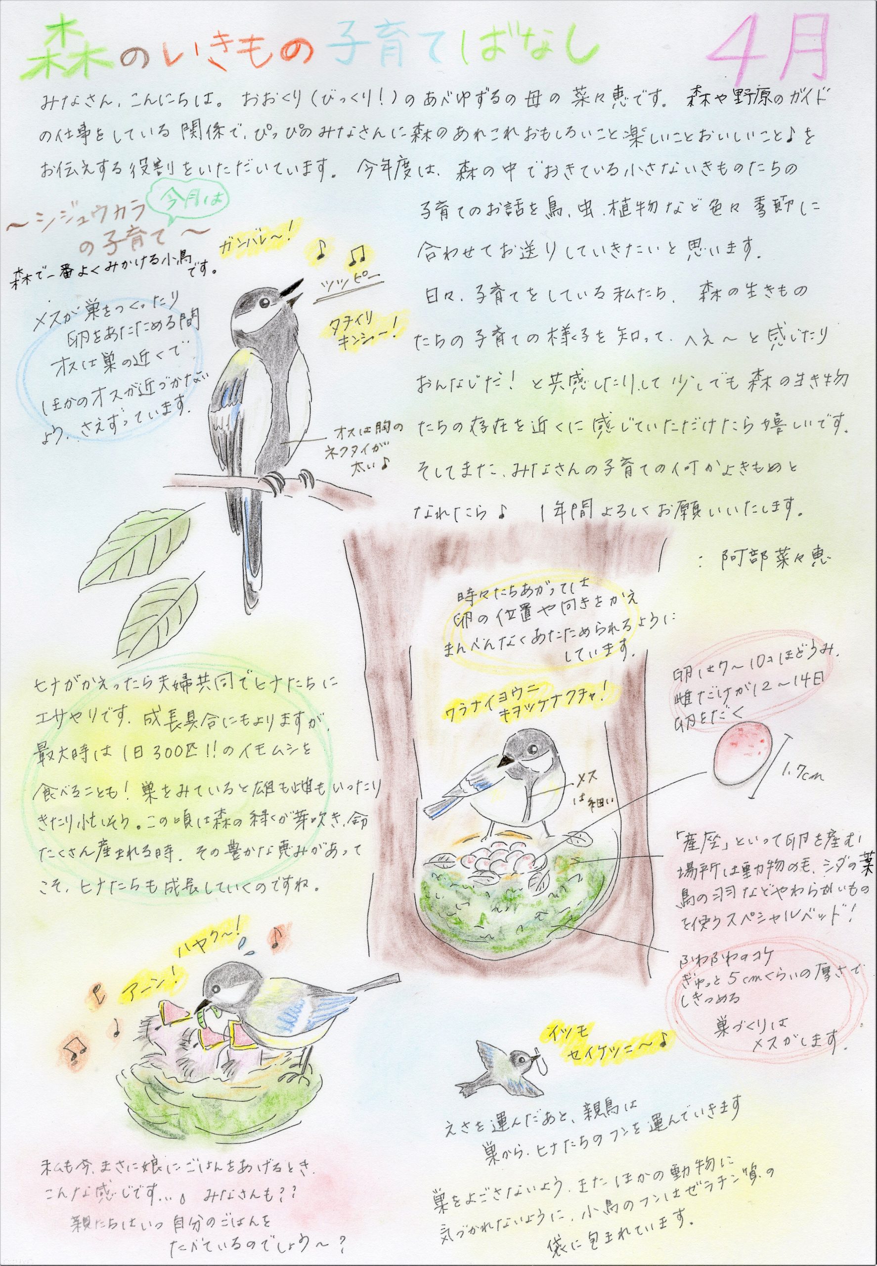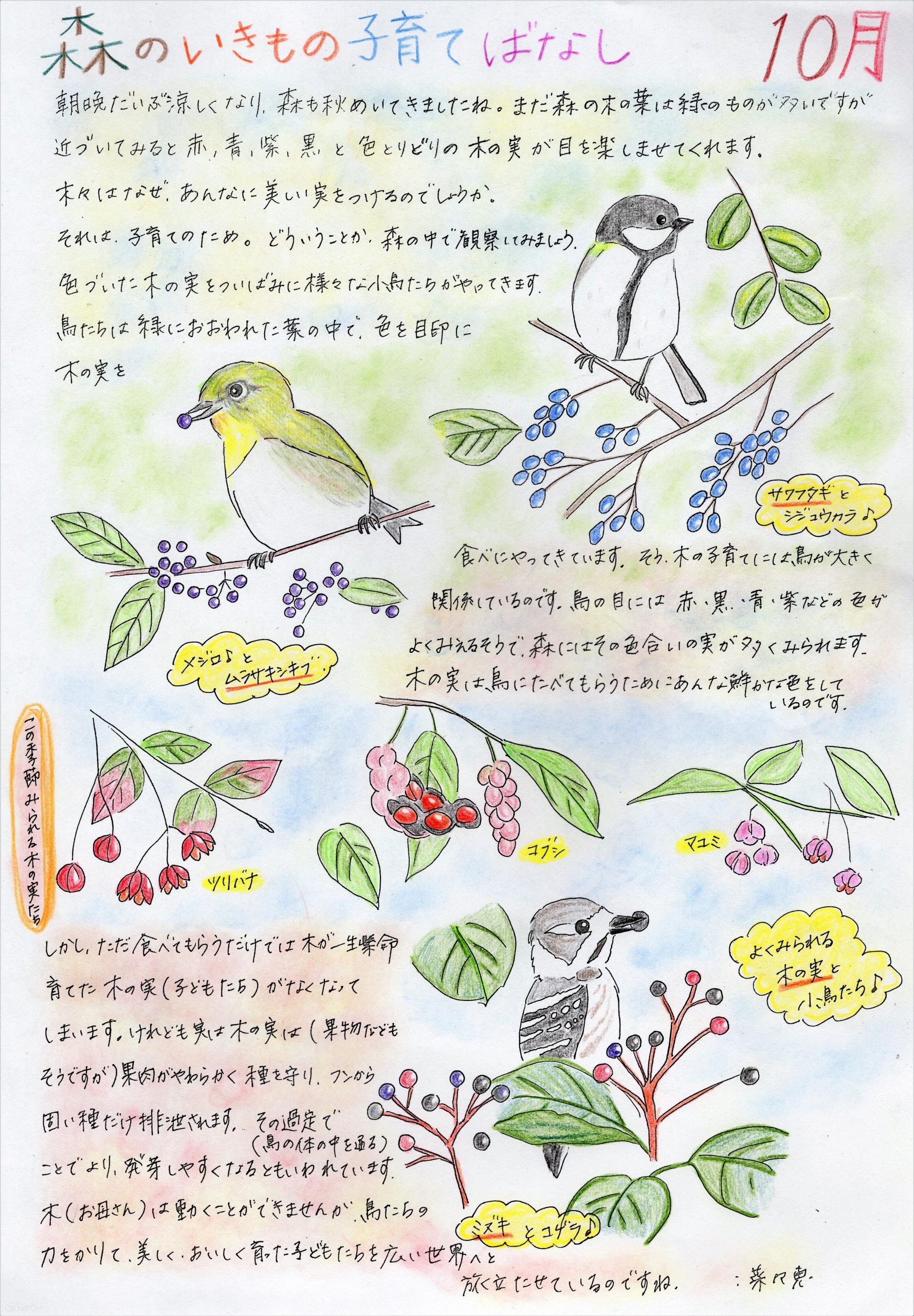 ホーム 森のいきもの子育てばなし ぴっぴスタッフななさんが「ぴっぴだより」で描かれた「森のいきもの子育てばなし」です。森のお話を色彩豊かにお伝えいただいており、森のことを身近に感じていただけると思います。どうぞ森のお話をお楽しみください。 4月 5月 6月 7月 8月号 9月 10月 11月 12月 1月 2月 3月 総集編