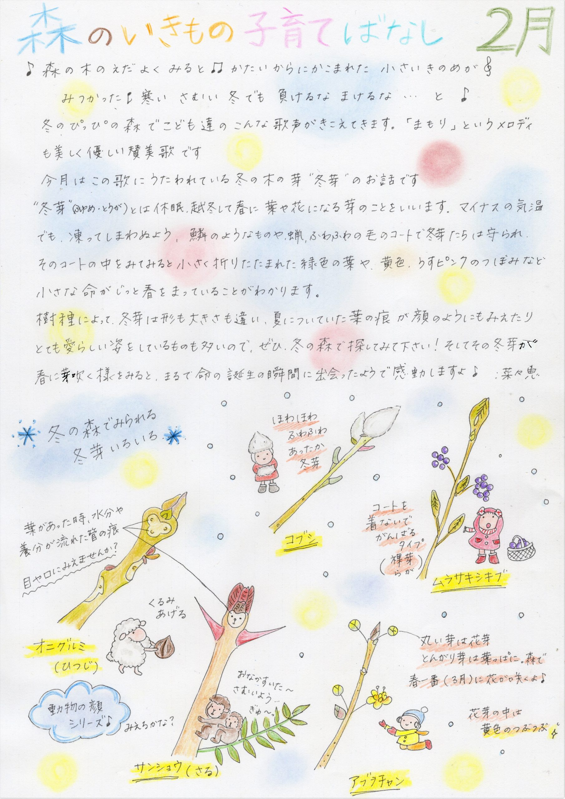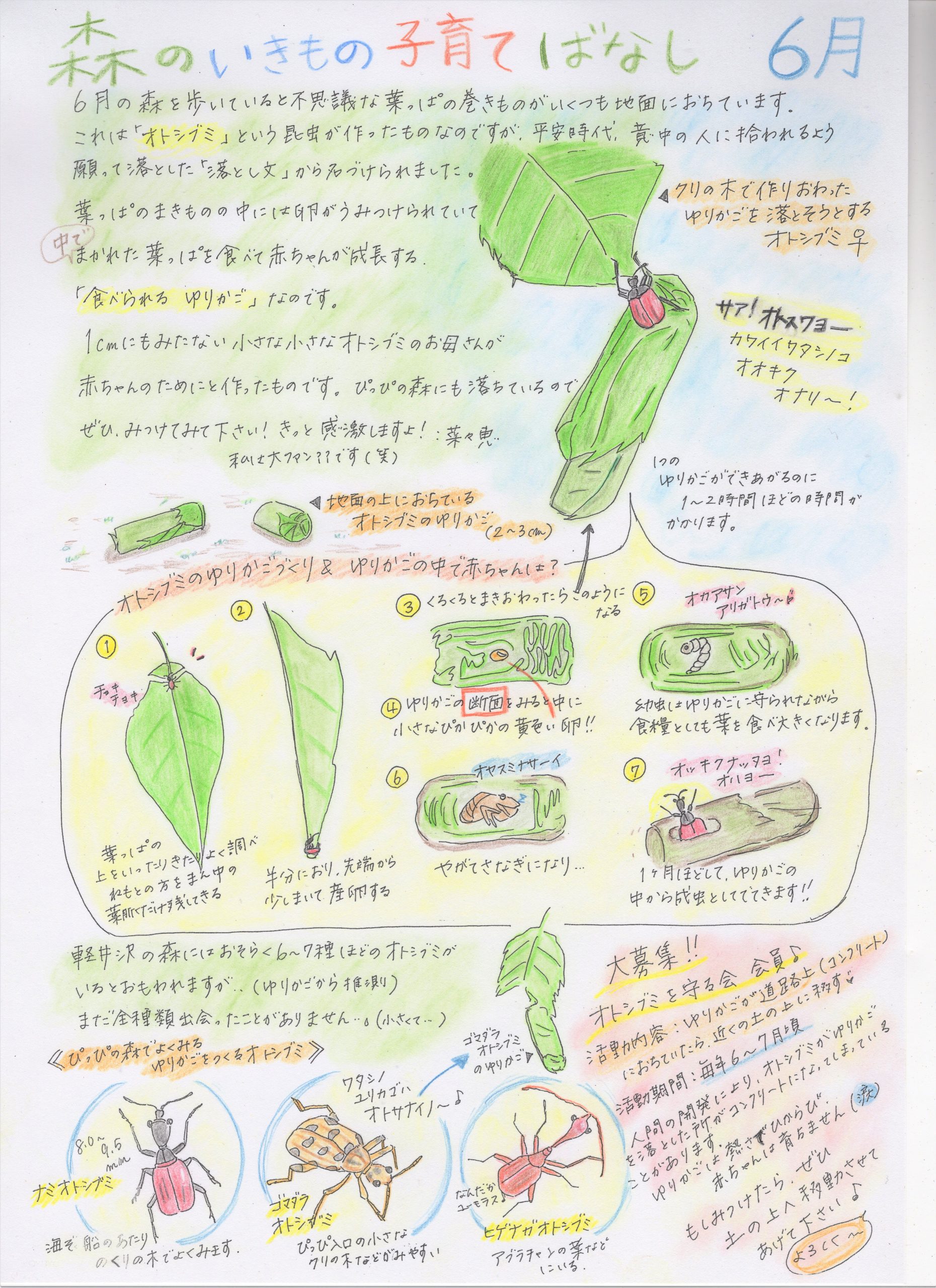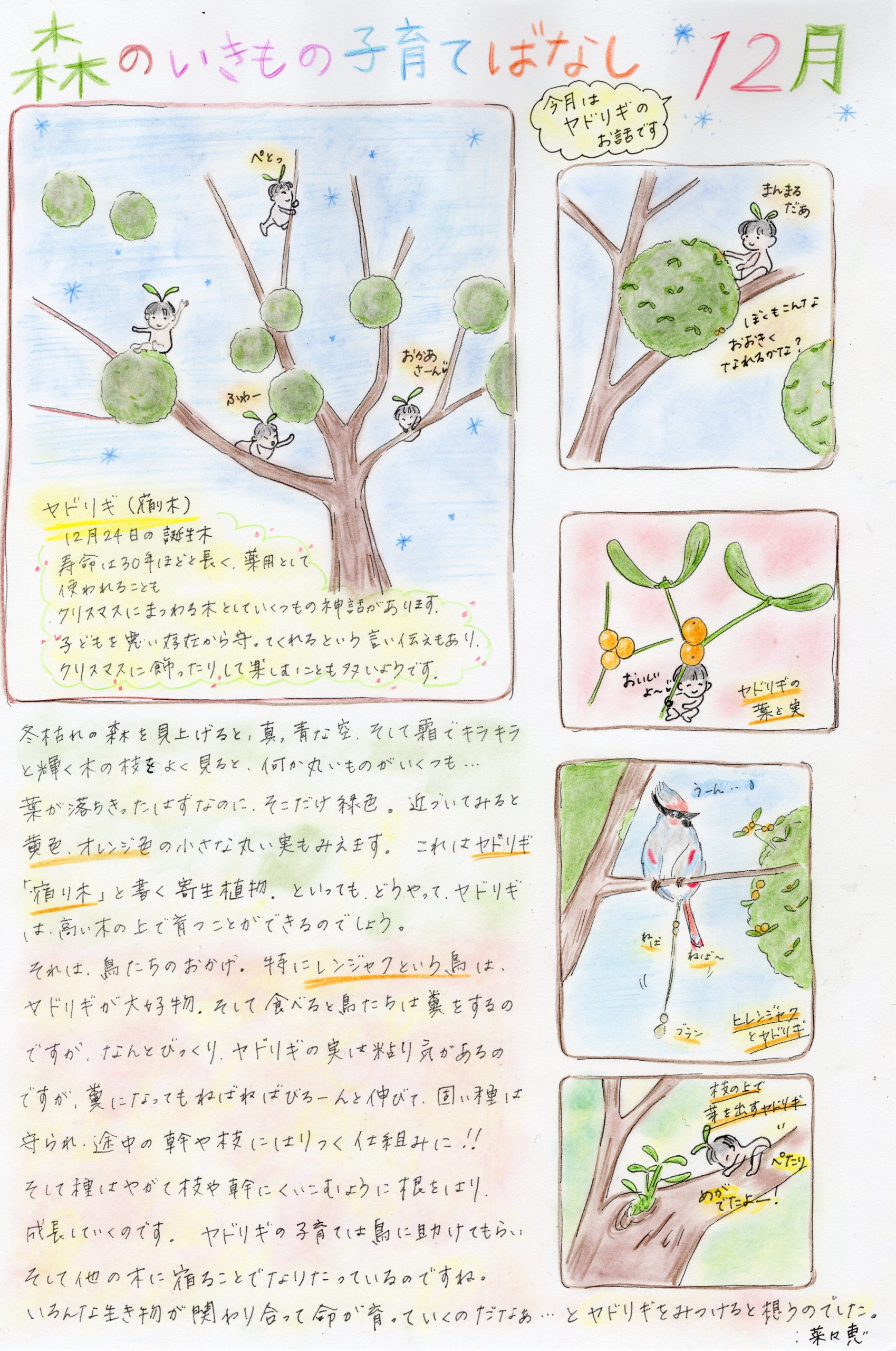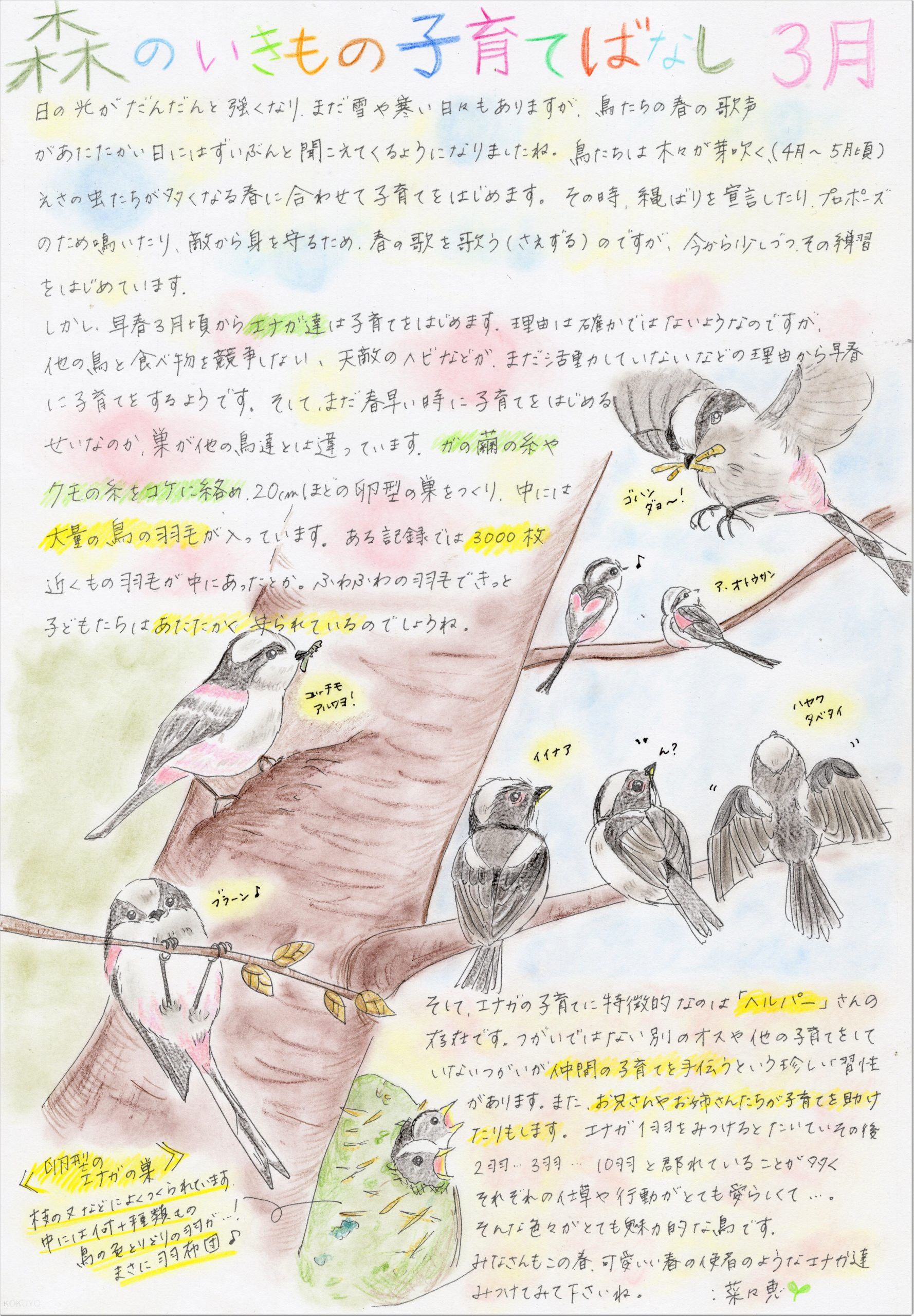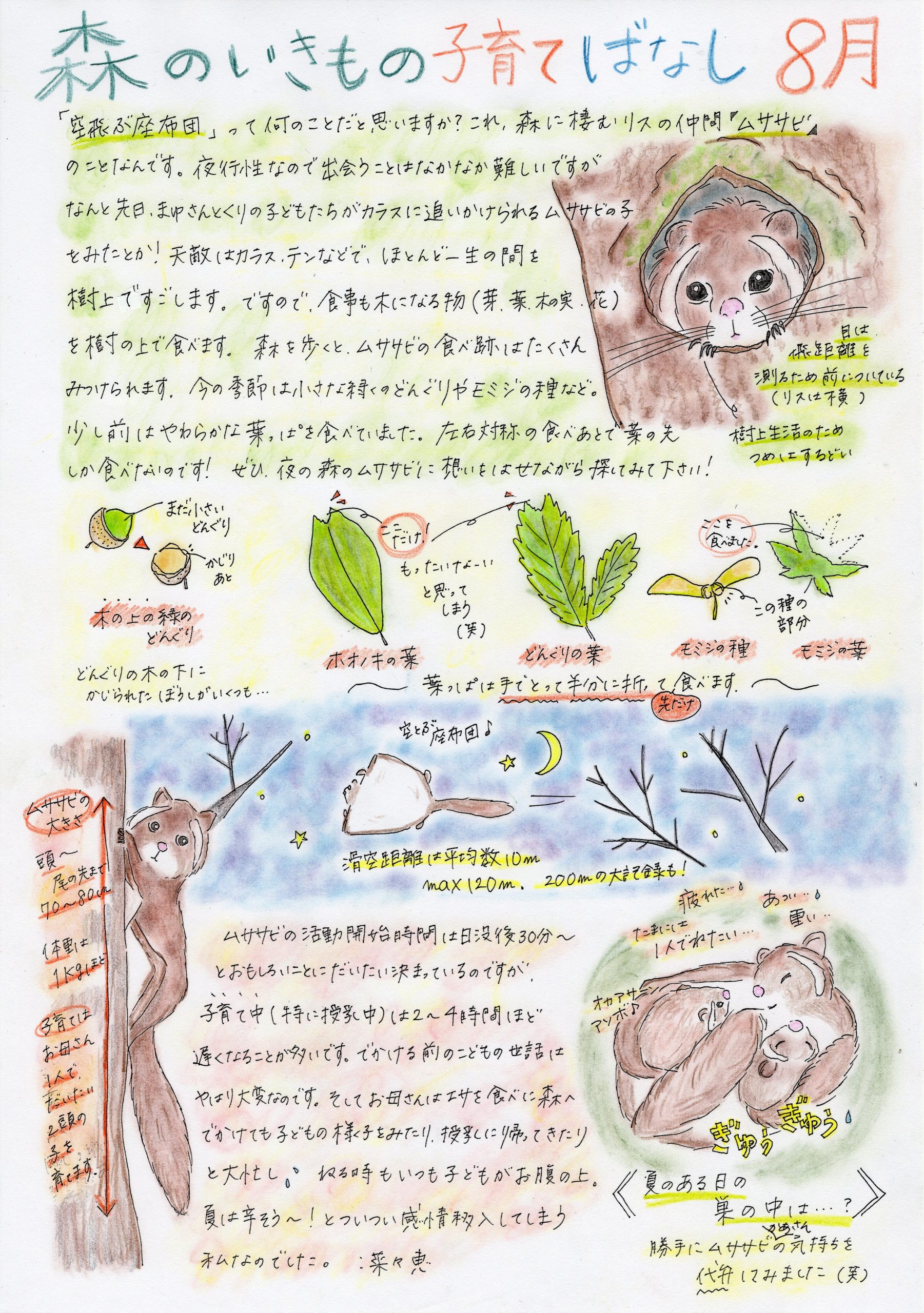 ホーム 森のいきもの子育てばなし ぴっぴスタッフななさんが「ぴっぴだより」で描かれた「森のいきもの子育てばなし」です。森のお話を色彩豊かにお伝えいただいており、森のことを身近に感じていただけると思います。どうぞ森のお話をお楽しみください。 4月 5月 6月 7月 8月号 9月 10月 11月 12月 1月 2月 3月 総集編