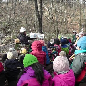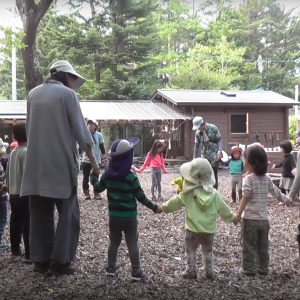 「朝のあつまり」 森の中 切り株にすわり お陽さまの光 風 鳥の声 季節の匂いを感じながら みんなが集まるひととき みんなで歌をたのしもう おはなしの世界をたのしもう |