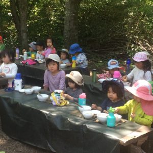 「ランチ」 おひさまの光や風を感じながら、森の中でいただくランチ。 友だちと一緒に食べる、楽しいひととき。 ぴっぴランチも、おうちの人が作ってくれたお弁当も、 自然を感じながらみんなと一緒だから、美味しい! |
